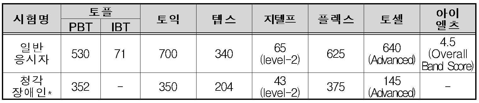 | - | 영어 | 공인어학성적(토익, 토플, 텝스 등)으로 대체 |