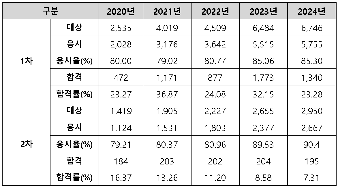 🔻1차 시험은 2차 시험에 비해 합격률이 높지만, 응시자 수가 꾸준히 증가하고 있어 경쟁이 치열해지고 있습니다.