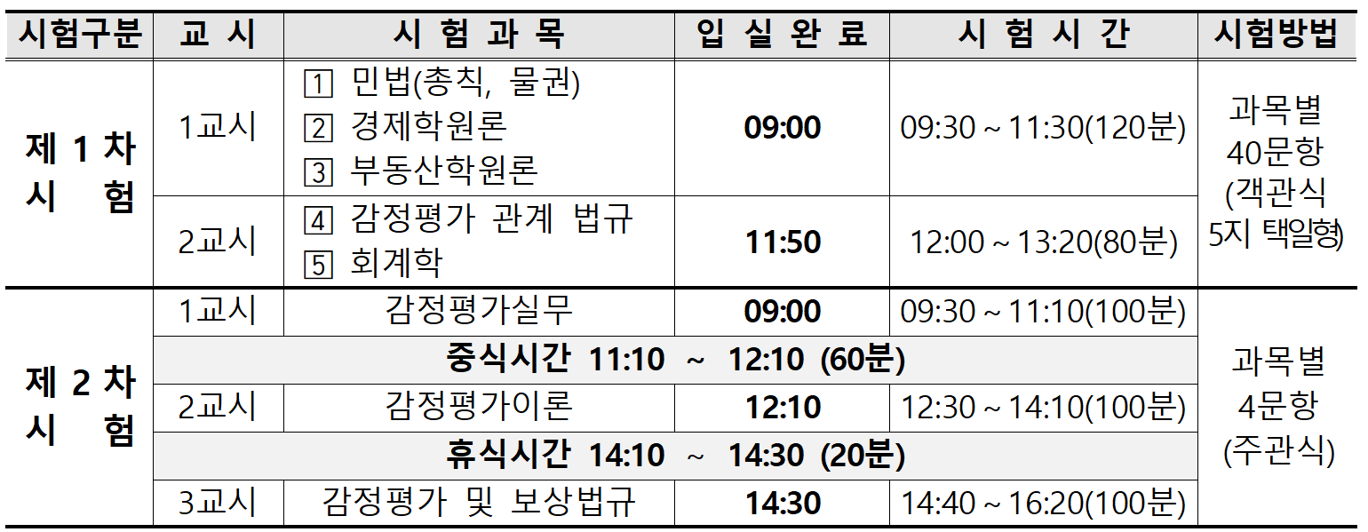 | 1교시 | 감정평가실무 | 감정평가 실무 기초, 물건별·목적별 감정평가 등 |