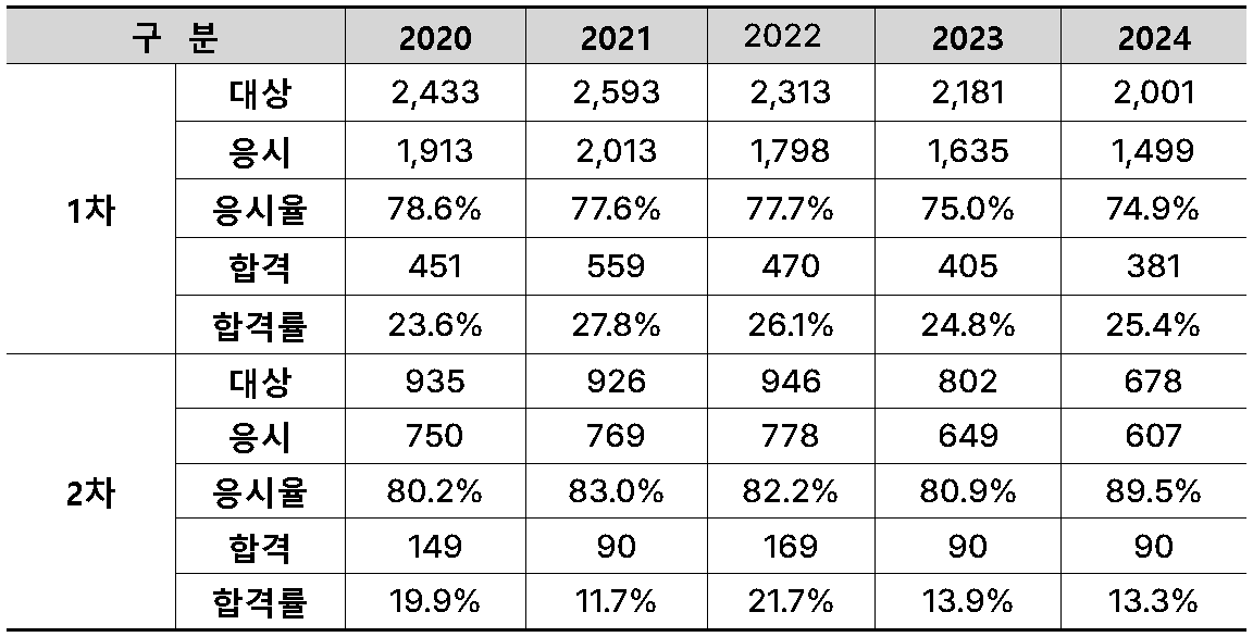 🔻1차 시험 합격률은 23.6~27.8% 사이로, 비교적 높은 편입니다.