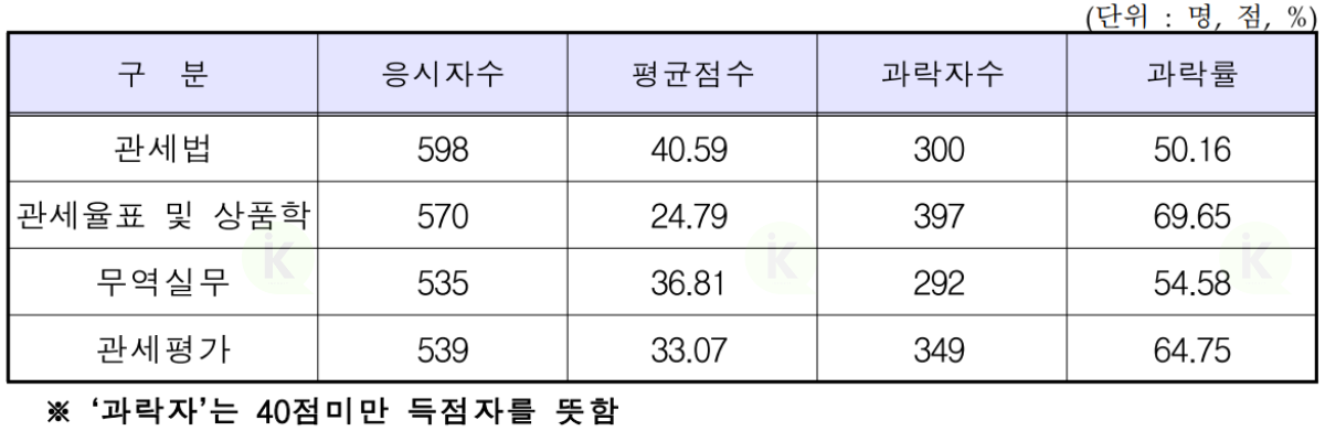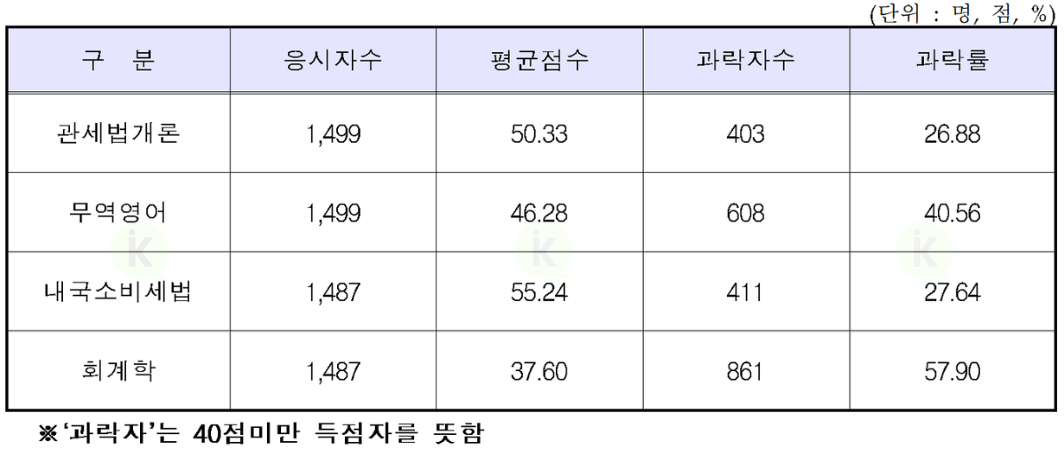관세율표 및 상품학은 거의 70% 가까운 과락율과 평균 점수가 24.79점으로 상당히 어려웠다는 알 수 있습니다. 나머지 과목들의 과락률도 약 50 ~ 64%대로, 관세사 2차 시험 난이도는 매우 높았습니다.