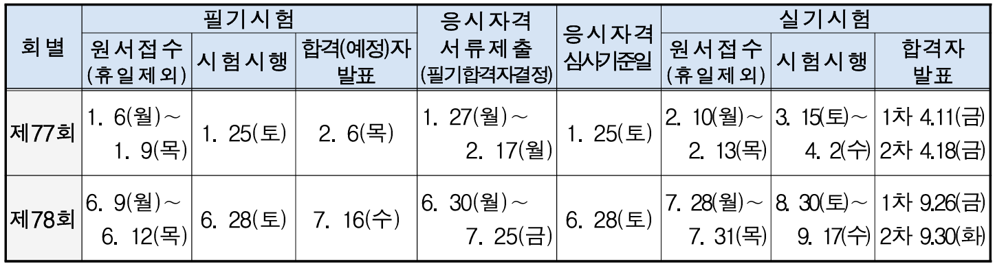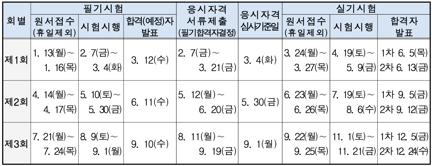 | 회별 | 필기 원서접수 | 필기시험 | 필기 합격발표 | 응시자격 서류제출 | 실기시험 | 최종 합격발표 |