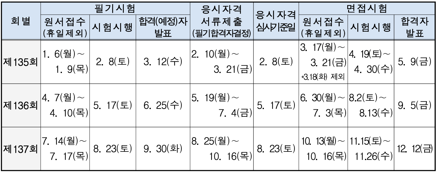 | 회별 | 필기 원서접수 | 필기시험 | 필기 합격발표 | 응시자격 서류제출 | 면접시험 | 최종 합격발표 |