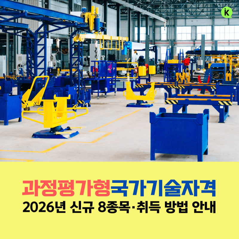 2026년 국가기술자격 과정평가형 신규 종목은 산업 변화와 최신 트렌드에 맞춰 총 8개의 신규 자격증(화약류 제조기사, 스마트공장산업기사, 전기공사산업기사, 스마트공장기능사, 기중기·로더·롤러·불도저운전기능사)이 신설됩니다.